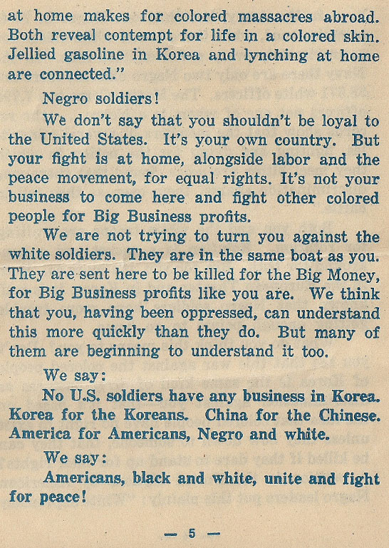Crni vojnici, da li ste se ikada zapitali zašto ste u Koreji, i zašto se borite protiv drugih obojenih naroda, dok se linč, ubistva i uvrede protiv crnaca gomilaju kod vaše kuće?