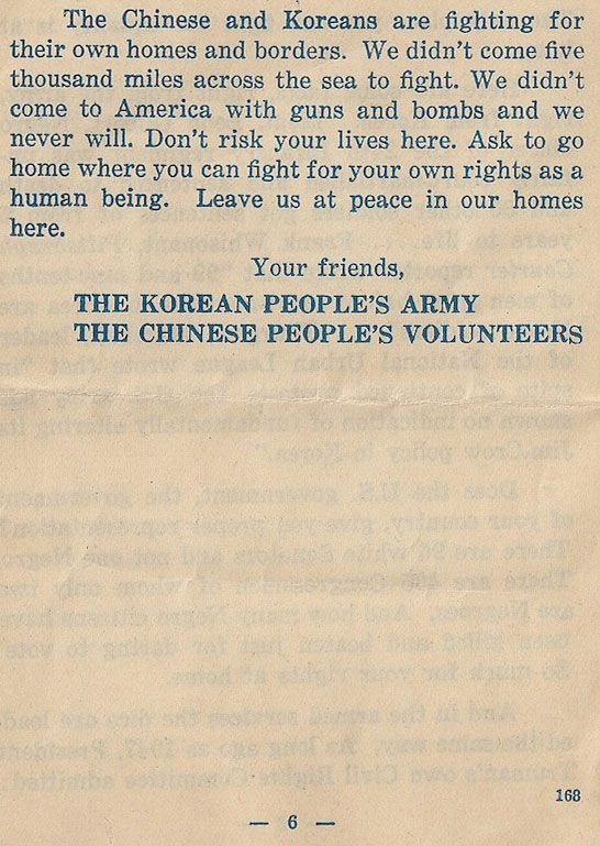 Armija Demokratske Narodne Republike Koreje više je puta štampala letke sa porukom Afroamerikancima u redovima američke vojske i širila ih na frontu, tokom Korejskog rata (1950-53). Evo nekoliko isečaka: